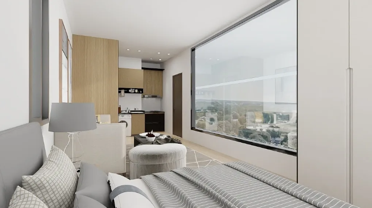 - One Cozy Bedroom: The home features a spacious one-bedroom layout that offers a peaceful, private retreat. The bedroom is designed to optimize space with smart storage solutions, including built-in closets or shelving units, while maintaining a minimalist aesthetic that encourages rest and relaxation. Large windows bring in natural light and provide a connection to the surrounding environment, allowing the beauty of nature to become part of the living experience.