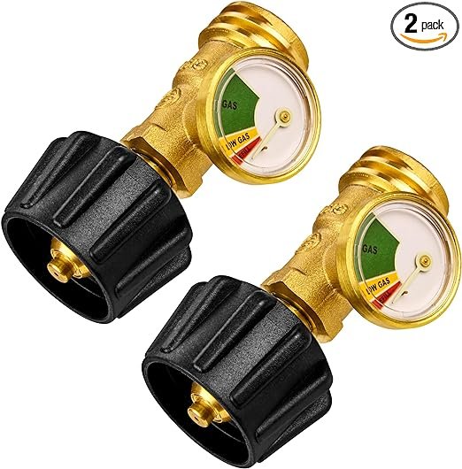 Flame King Propane Tank Gauge Level Indicator, Leak Detector Gas Pressure Meter, Color Coded & Glows in The Dark, Universal for All Cylinders, Solid Brass (2-Pack)