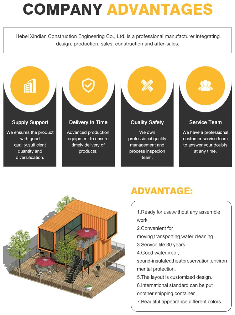 1. Do you provide on-site installation service? We provide very detailed installation instrution drawings and videos for every project. For large projects, we will have both installation workers and supervisiors on site. The fee for the on-site service should be negotiated with clients. 2.What’s your delivery time? Normally, delivery time is 15 days after deposit received. For large order, the delivery time should be negotiated. 3.How to control the quality of your product? a. quality of the design: think about possible problems in advance and provide a high-quality design solution. b. quality of the raw material: choose the qualified raw material c. quality of the production: precise manufacturing technique, experienced workers, strict quality inspection. 4. How to deal with quality problems? Warranty is 2 years. Within the warranty period, XDH will responsible for all quality problems caused by our production. 5. If there is a clear service life of your products? If have, how long? Under conventional climate and environment, the service life of container house steel frame is 20 years 6. What designs do you have in different climates (How can the products adopt to different climates)? Strong wind region: improve the wind-resisting ability of the internal structure. Cold region: increase the thickness of the wall, or use good insulation material, improve anti-pressure ability of the structure. High corrosion region: use corrosion resistant material, or paint anticorrosive coating.